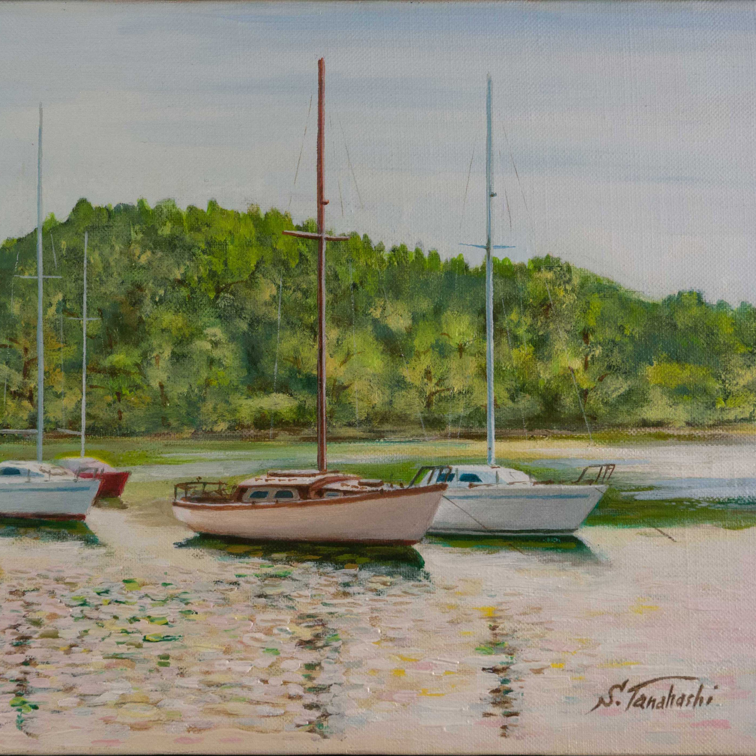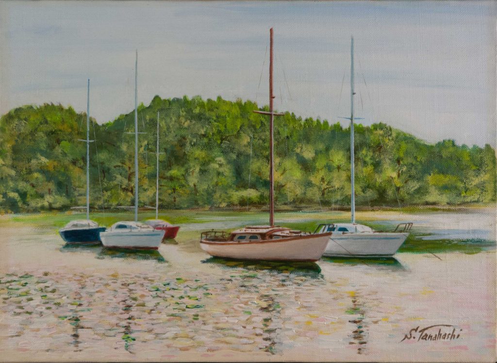 水辺の春(五ヶ所湾) 2023.06.13 水辺の春(五ヶ所湾) 1992年 F4 油彩画ヨットレースで五ヶ所湾まで行った際に印象に残ったVOCヨットクラブのヨットと水辺の新緑を映す水面。この頃から水と光の織り成す印象派的な表現に魅力を感じる様になった。