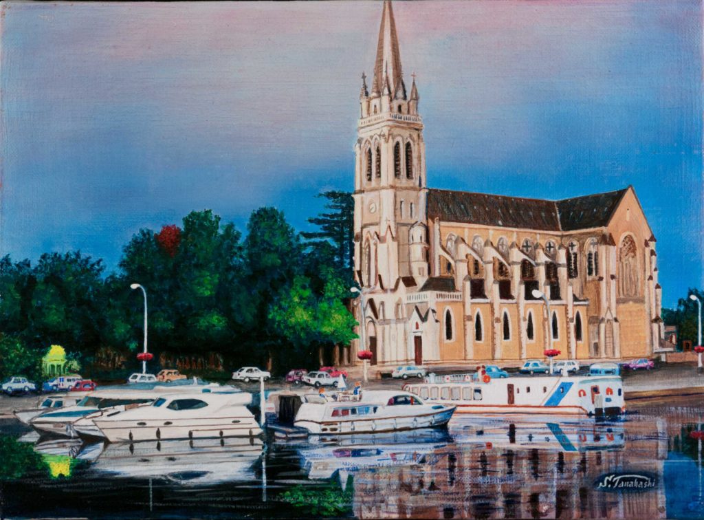 サブレの聖堂 2023.06.13 サブレの聖堂 2001年 F4 アクリル画フランスの運河を借り切りのボートで巡る運河旅行をした際、サルト川の中流に位置する街サブレに着いた。夕陽に映える聖堂が美しい。サブレは菓子の名で知られた小さな街。