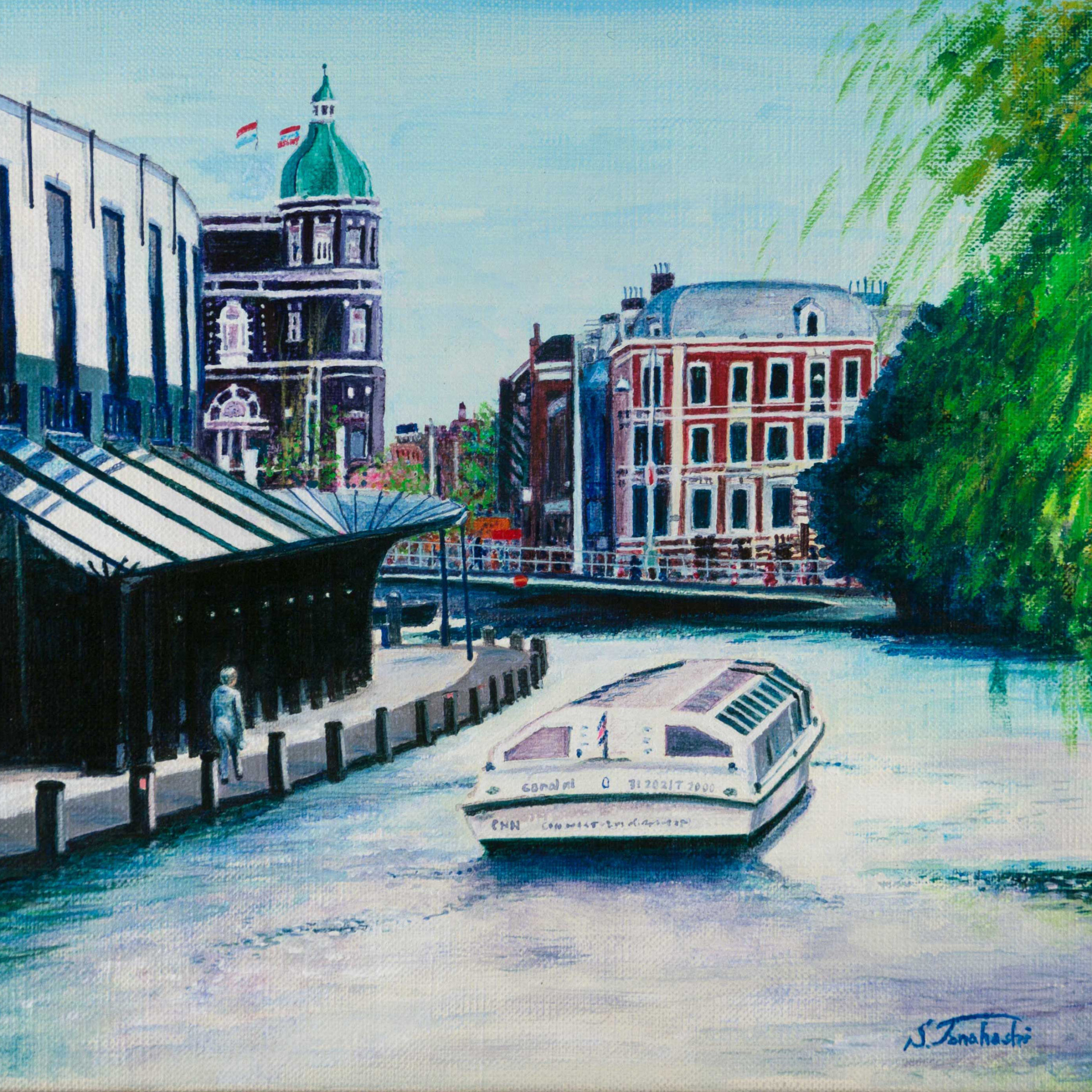 観光船の通る運河 2023.06.13 観光船の通る運河 2014年 F4 アクリル画観光船は多くの橋の下を通るので、背丈が低くできている。またその場回頭が容易なように、船首にサイドスラスターを有している。日本語の観光案内が聞ける観光船も運航されている。